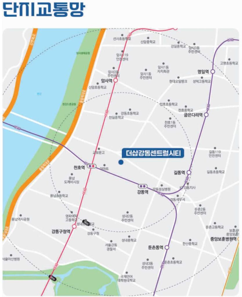 교통5호선 상일동역 도보 3분, 9호선 연장 예정(고덕강일역 신설 시 접근성 향상)올림픽대로·서울양양고속도로 진입 용이