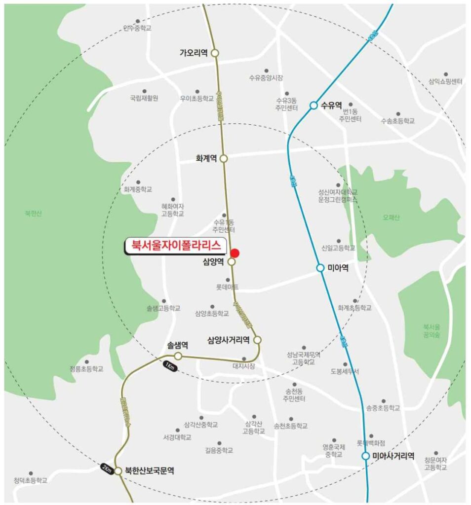 | 교통 | 4호선 수유역·미아역 차량 10분 내외, 우이신설선 솔샘역 도보 이용 가능, 내부순환로 접근 용이 |