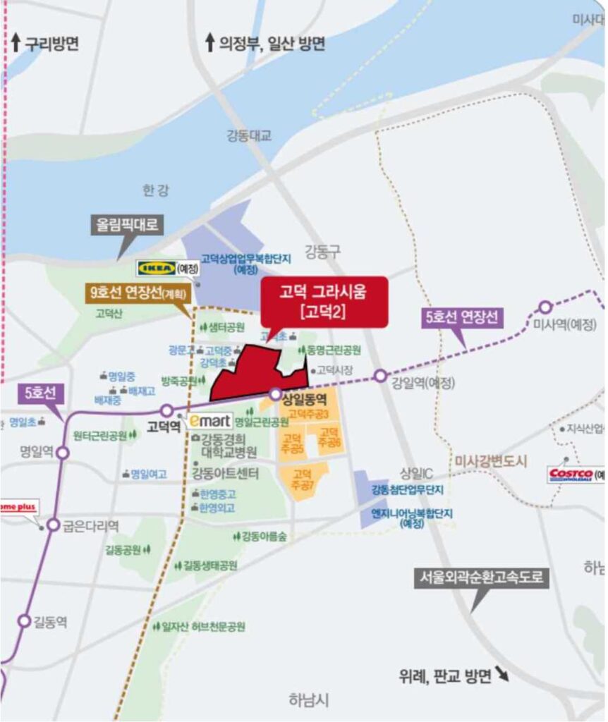 교통5호선 고덕역 도보 7분, 9호선 고덕강일역(예정) 개통 시 접근성 향상올림픽대로·강일IC 접근 용이, 강남·잠실권 30분 내 이동 가능